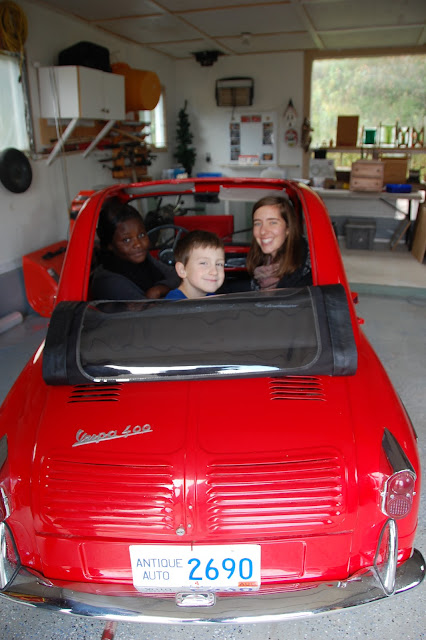 On our way back to the cabin Alison introduced herself to some neighbours called Doug and Irma Miller and we were invited into the garage to see Doug's prize possession, a tiny, red, 1950's car made by Vespa. Cutest car I have ever seen!